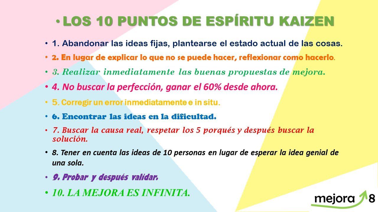 Y para terminar la esencia de todo el sistema, no basta con solo mejorar las cosas una vez, como se comentaba en el punto número uno, las cosas cambian, y lo que ahora puede parecer una mejora dentro de unos años es algo obsoleto que hay que mejorar de nuevo. La metodología no es algo estático que se hace y se queda igual siempre, sino un sistema en movimiento donde a cada paso se replantean de nuevo las ideas, las opciones y la forma de cambiar, en un ciclo que no termina, pues la mejora es infinita.